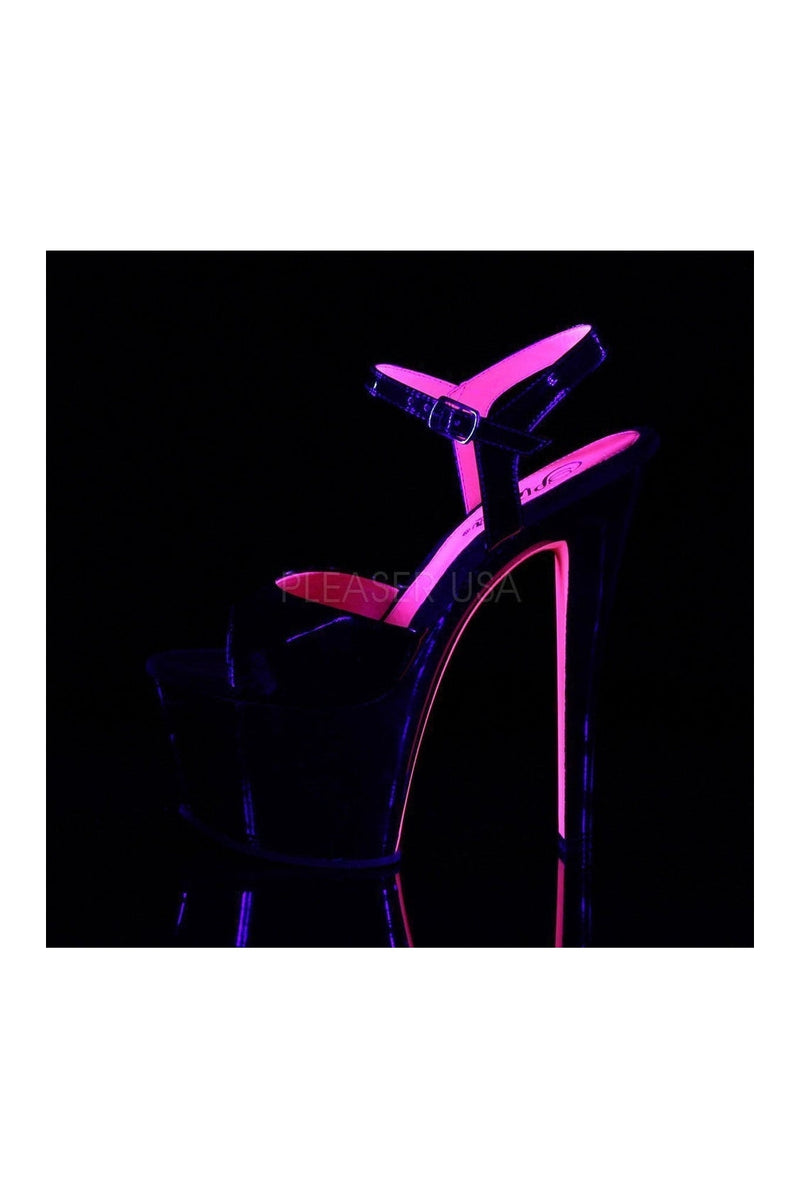 7" (17.8cm) Heel, 2 3/4" (7cm) Platform Two Tone Ankle Strap Sandal Featuring Neon Hot Pink UV Blacklight Effect