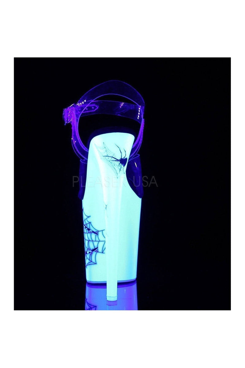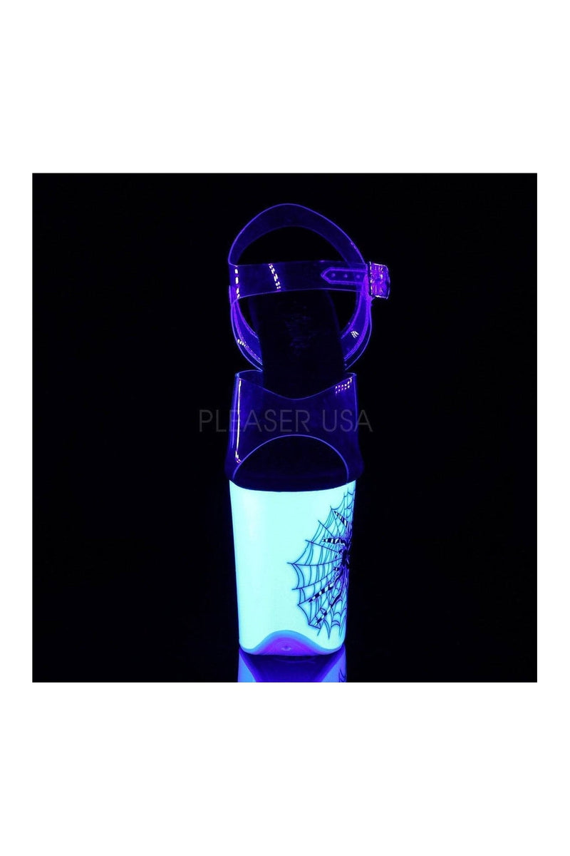 8" (200mm) Heel, 4" (100mm) Platform Ankle Strap Sandal Featuring Blacklight Reactive Spider Design on the Platform Bottom