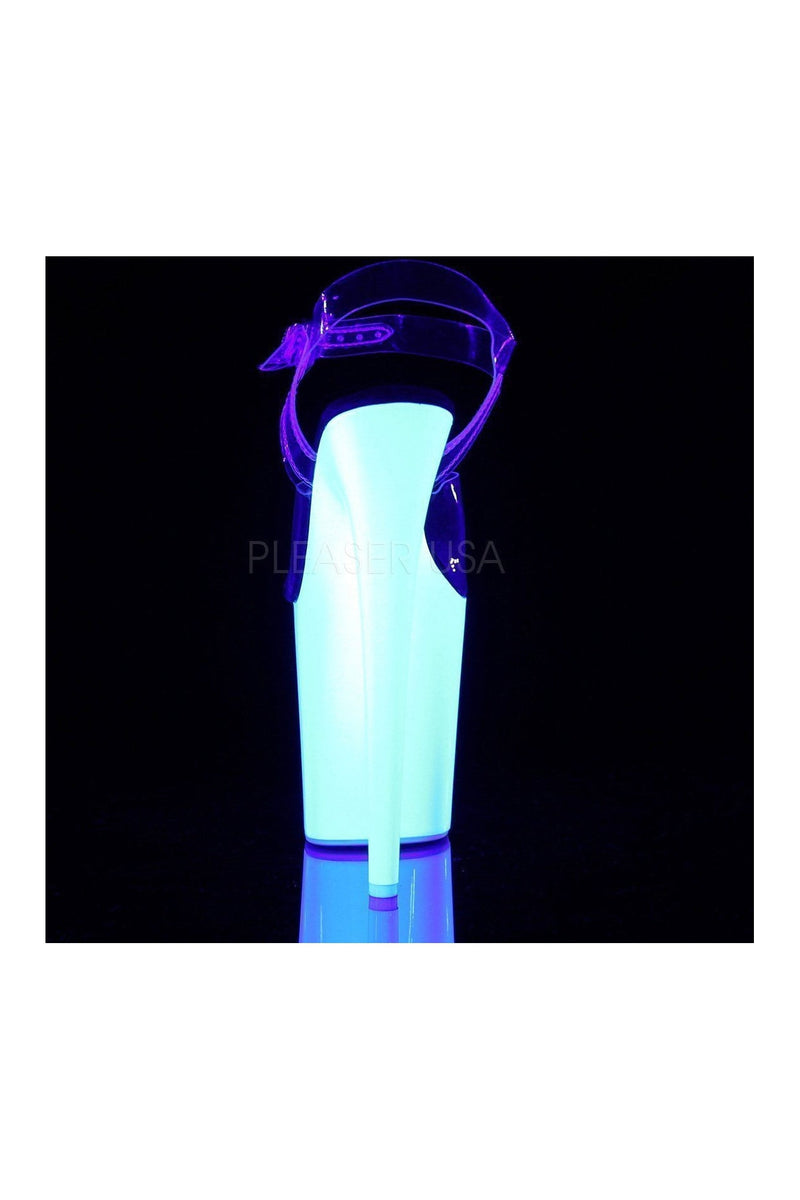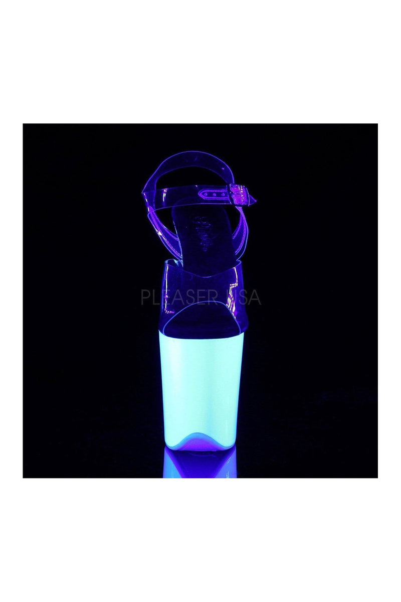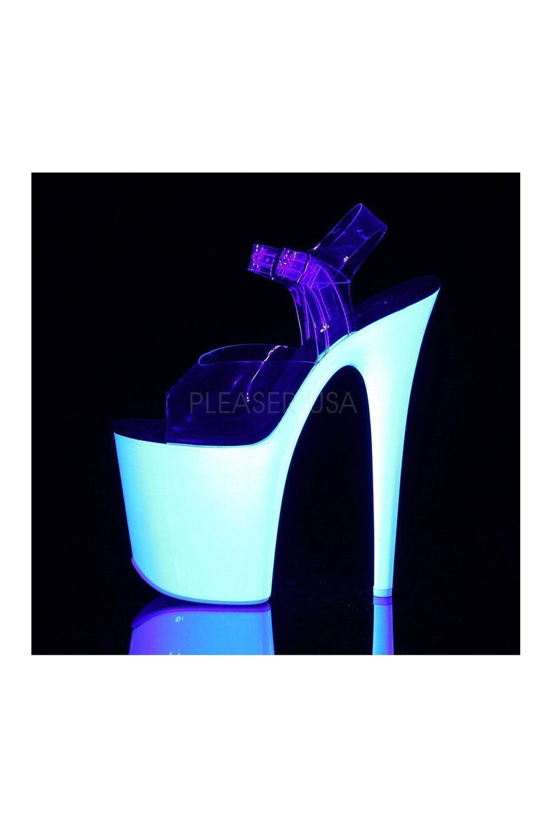 8" (20.3cm) Stiletto Heel 4" (10.2cm) Platform Ankle Strap Sandal Featuring the Entire Platform Outsole & Top lift Neon UV Reactive