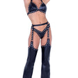 Ready for a ride on the wild side? This 2-piece faux leather bikini set features stud details and can be paired with thigh high boots or chaps for an unforgettable look. Featuring a halter-style top that goes behind the neck, this bikini is sure to ignite the flames!