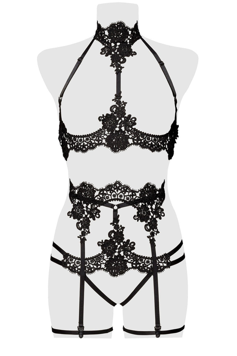 Floral lace under bust exotic set with choker and garter straps