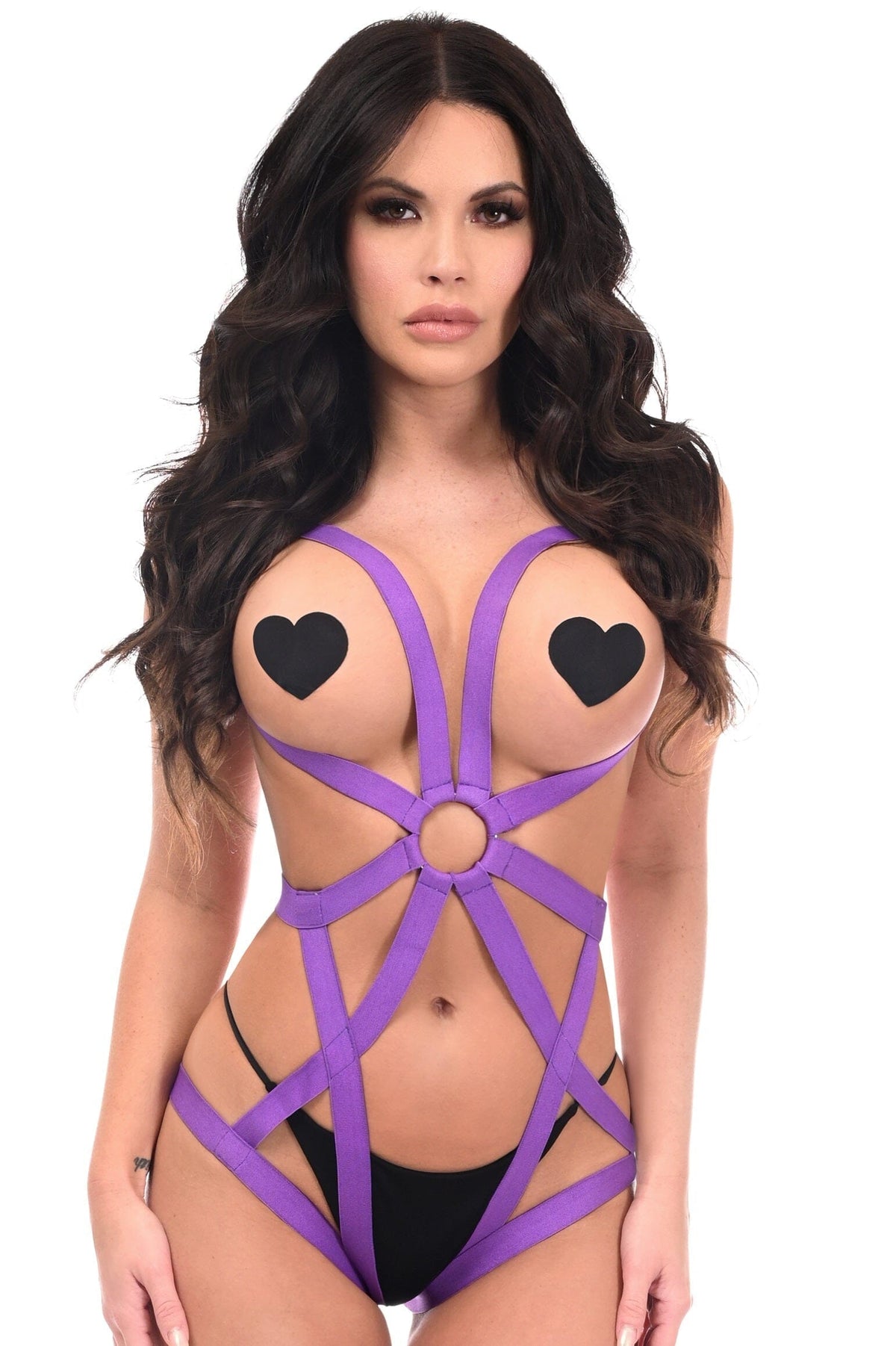BOXED Purple Stretchy Body Harness Bodysuit w/Silver Hardware