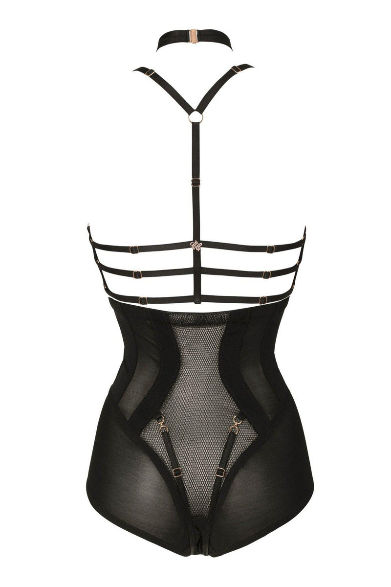 The bra has a double cup: a first one in mesh to shape the chest, and a half cup in foam covered with lycra to support the chest. The collar and back are entirely made of adjustable elastic bands. A button between the breasts allows you to attach the removable thong of the Josephine panties as in the photos.