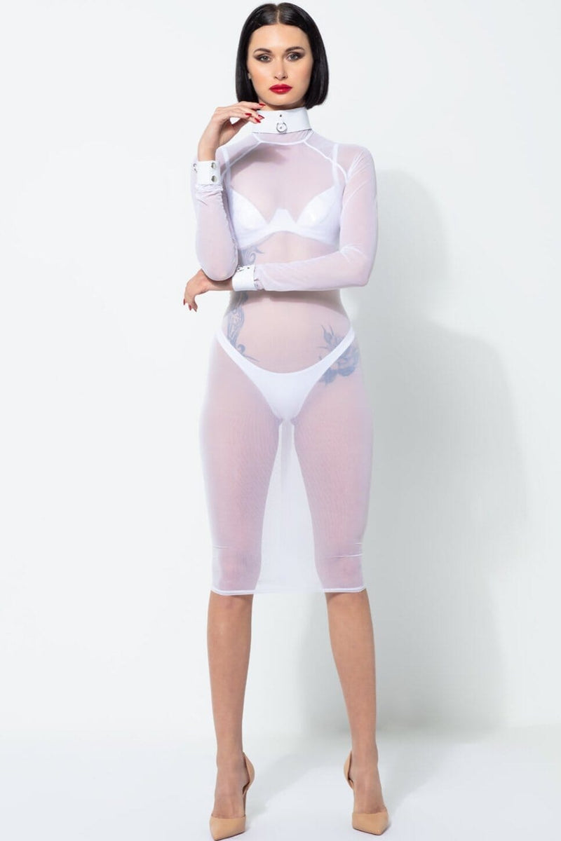 Experience the ultimate in fashion with AZIA Mesh Body Dress. This versatile piece can be paired with vinyl sets or worn alone for a daring, transparent look. Take your style to the next level with this must-have garment. Choker and Cuffs not included.