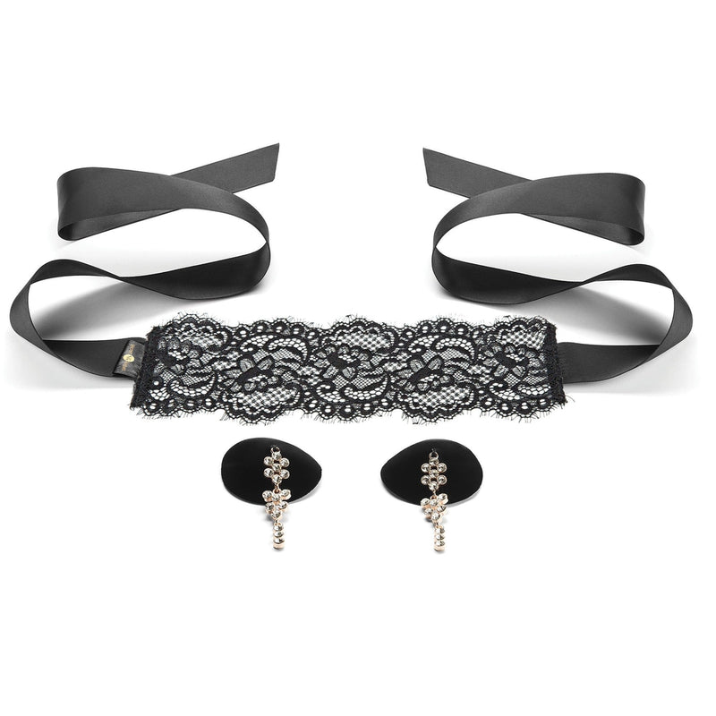 You'll be the queen of temptation in this beautiful set which includes a luxurious lace and satin blindfold and dazzling nipple pasties to adorn your body while you indulge in intimate bondage play or seduce your partner during foreplay. Light some candles and dim the lights and set the scene with the glamorous bondage style Temptation Set.