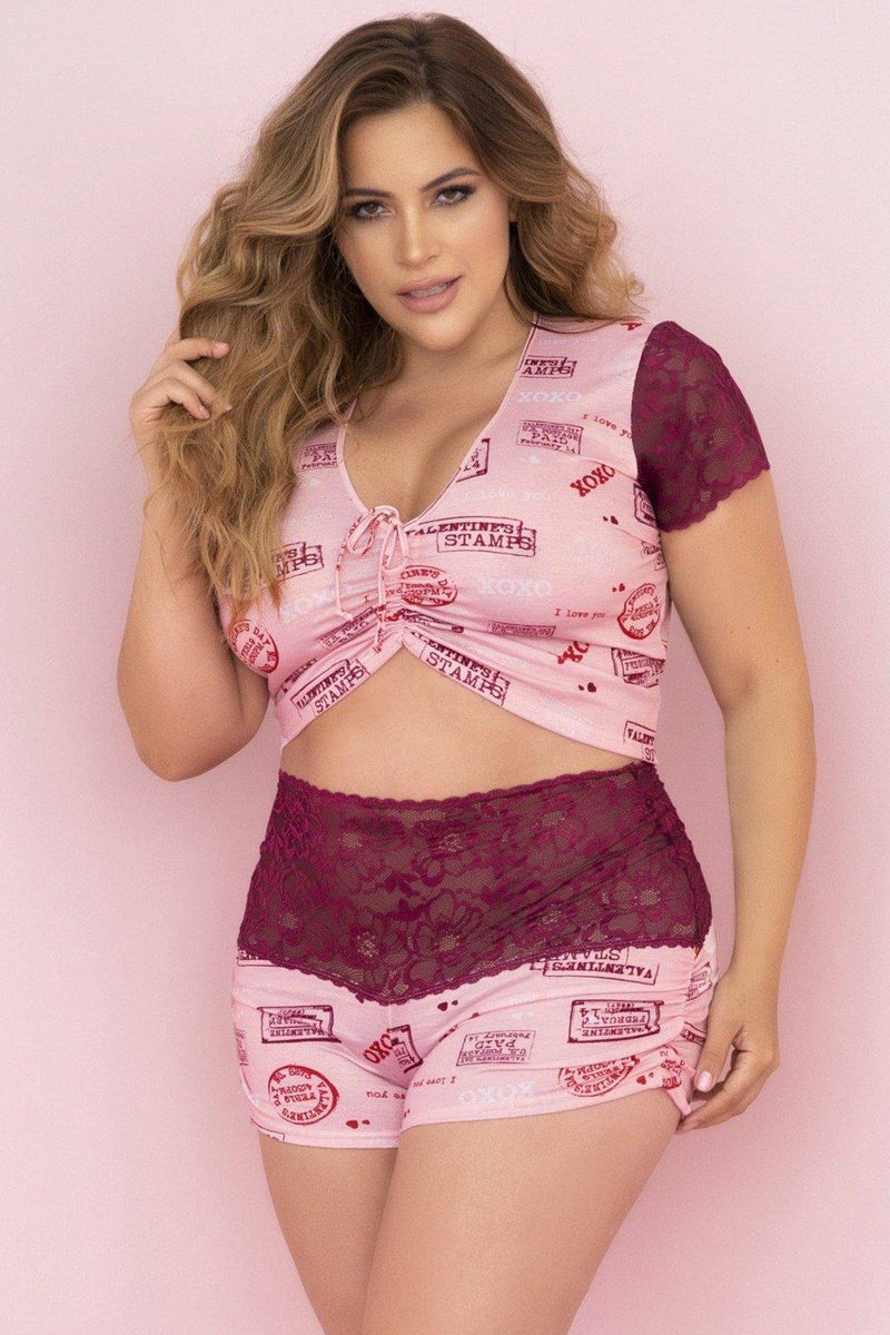 A versatile top with postcard print in the colors of romance and love, exquisite floral lace and a high-waisted shorts will give you a comfortable and idyllic Valentine's Day night.