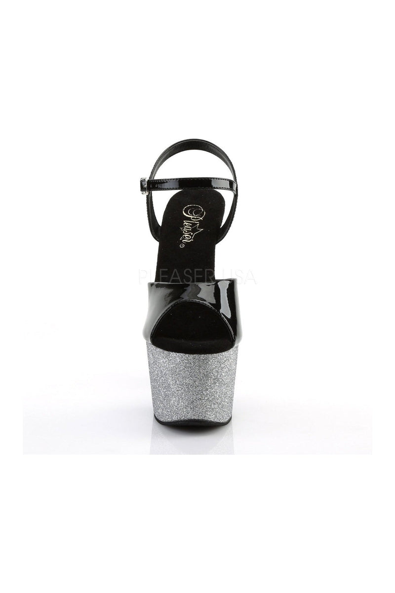 7" (178mm) Heel, 2 3/4" (70mm) Platform Ankle Strap Sandal Featuring the Entire Platform Bottom Covered W/ Multi Colored Glitters for an Ombre Effect