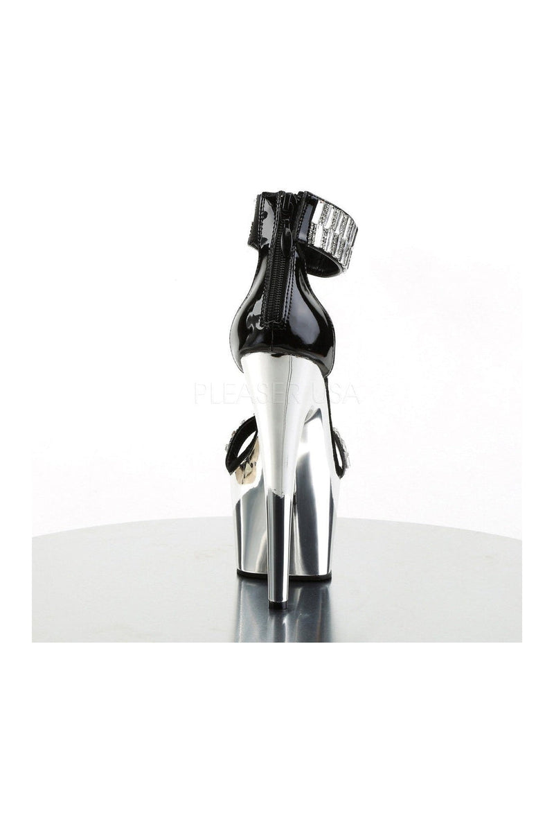 7" (17.8cm) Stiletto Heel 2 3/4" (7cm) Chrome Plated Platform Closed Back Sandal Featuring Rhinestone and Mirrors Embellished All Over Ankle Cuff & Toe Strap with Back Zip Closure