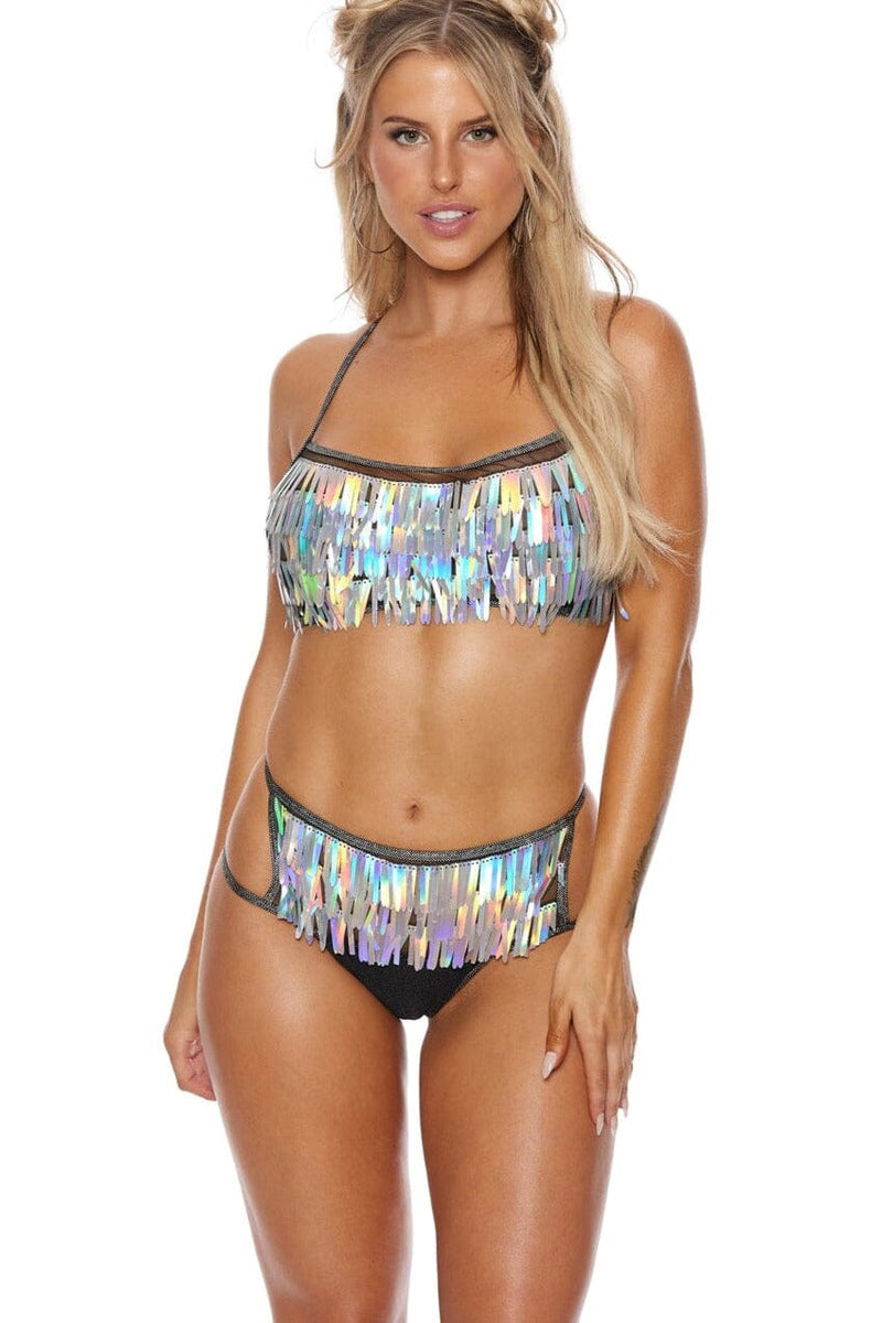 Iridescent sword fringe Bra top with mesh top front with playful fringe, adjustable and detachable shoulder straps "X" at back hem. Color: Iridescent. Size: One Size. Swimwear/Dancewear.
