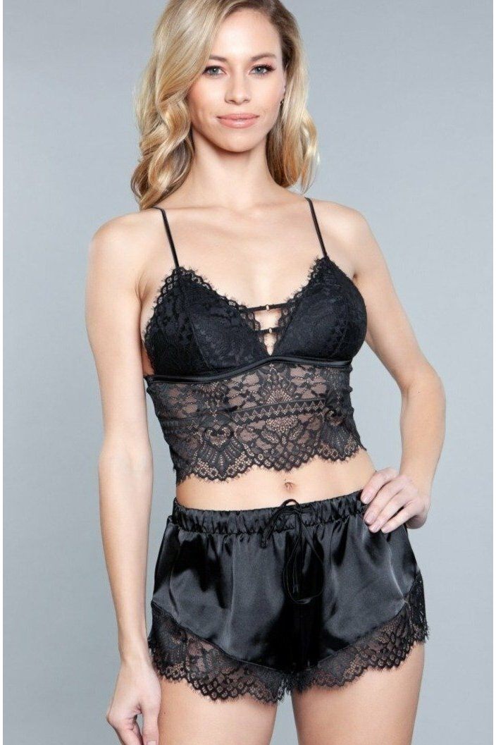 Lace crop top, with adjustable straps and satin lace trim shorts