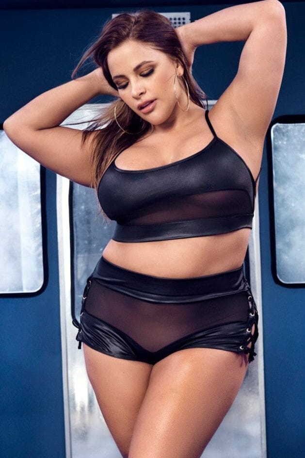 Sensuality and comfort at its best. Set in sheer and wet-look fabric with mesh underboob detail and crisscross eyelets on the side.