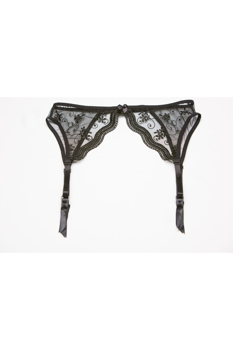 Scalloped Embroidery Garterbelt with adjustable back and garters. Colors: Black, Pink, Purple, White, Red. One Size. Shown with No. 5027 Stockings and No. 10 Panty. Also available in Plus Sizes.