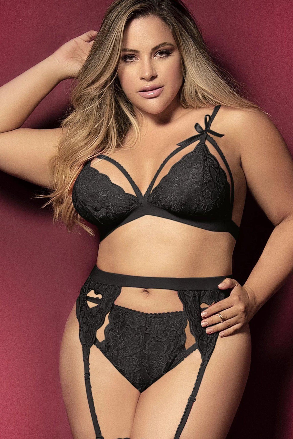 Three-piece lace set features a bra, thong and garter belt. Garter and thong feature sexy heart designs perfect for a romantic occasion. Top has decorative bows, adjustable straps and a clip in the back. Thigh-highs not included but sold in our catalog. Made in Colombia - South America with USA and Colombian fabrics.