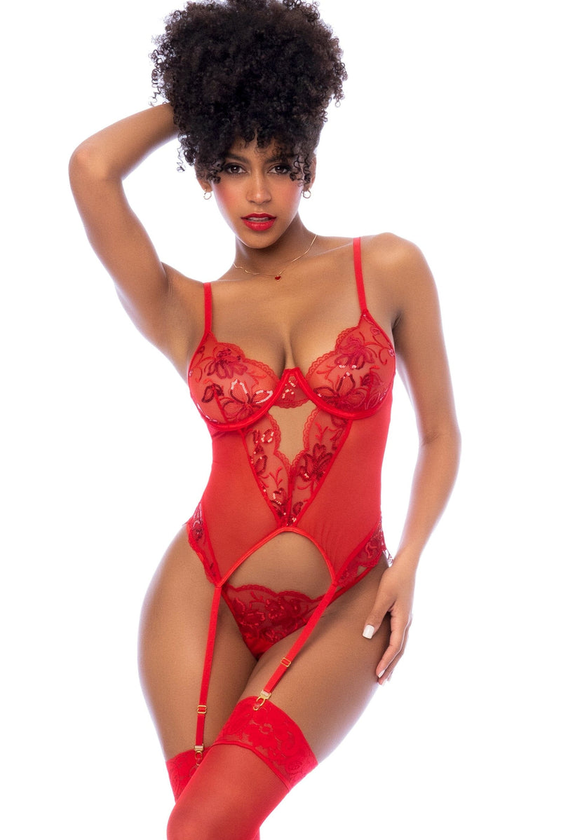This two-piece set screams passion. Featured in a sequin embroidered mesh, Includes a bustier with underwire, lace-up back design, adjustable shoulder straps and matching thong.