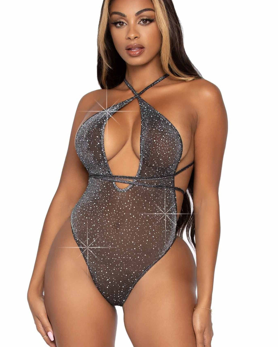 Shimmer Sheer Lurex Rhinestone Teddy With Thong Back & Convertible Wrap-Around Straps