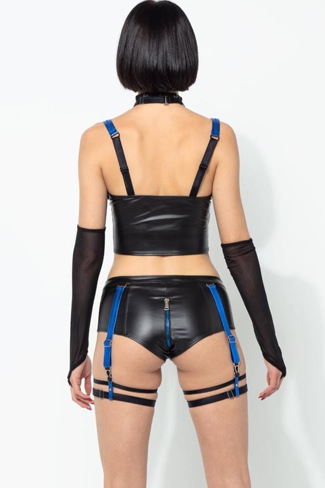 Get ready to show off your wild side with our LEOPARD crop top! The unique design, featuring bold blue straps and zippers, will make a statement wherever you go. Don't blend in with the crowd - stand out in style with this fierce crop top. Gloves and choker not included.