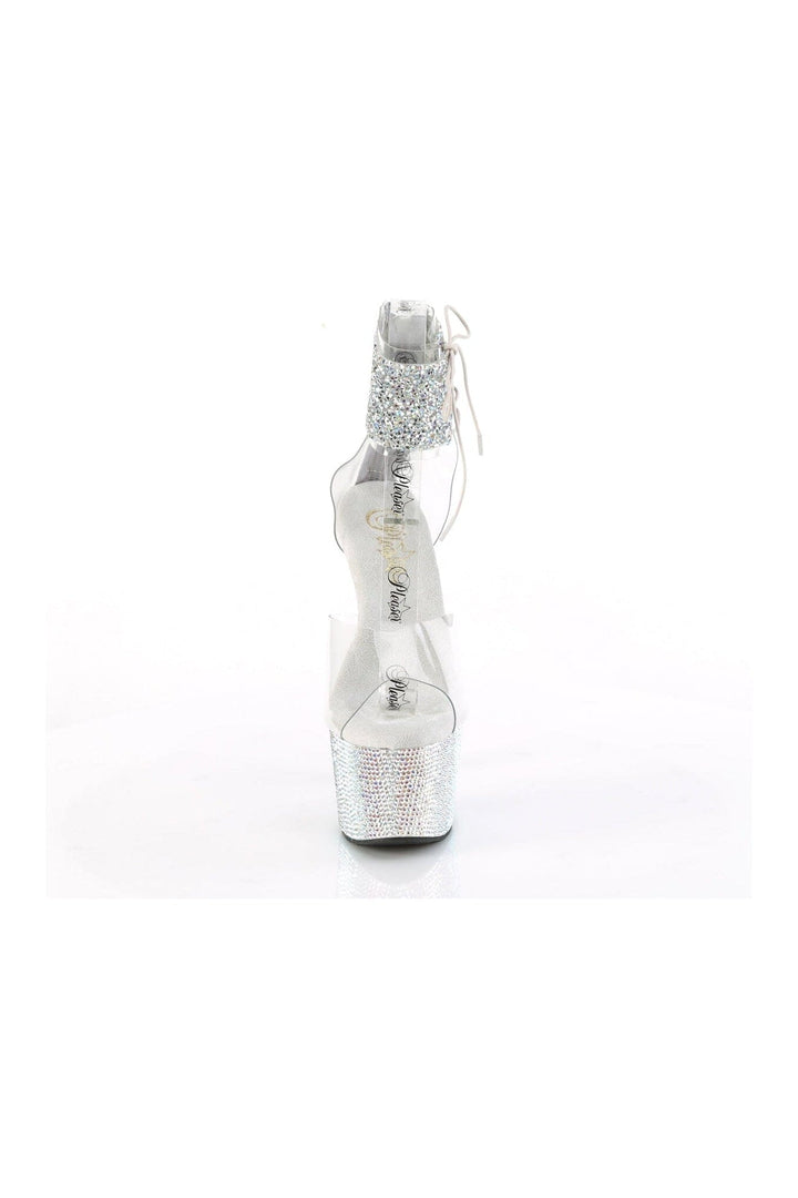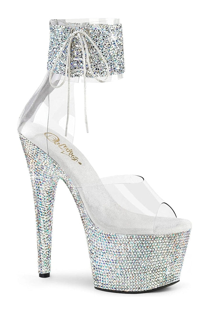 7" Heel, 2 3/4" Platform Ankle Cuff Sandal with Rhinestones, Back Zipper