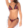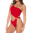 This one-shoulder one-piece swimsuit features a striking cut-out design through the center, enhanced with gold ring details for a touch of luxury. It offers an adjustable back and thong-style bottom for a flattering fit.