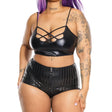 Front to back 2-way metal zipper with hook & eye reinforcement metal ring and rivet details. Booty short cut.