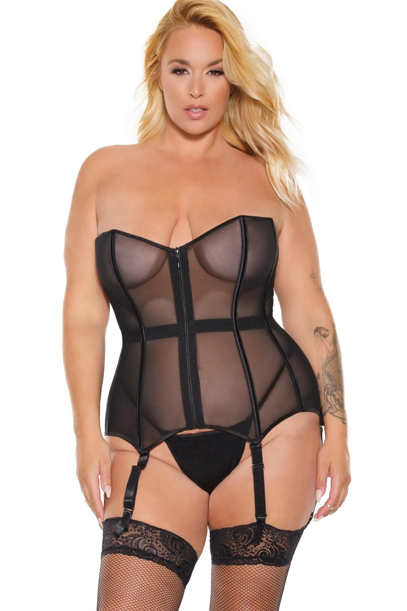 Fully boned corset with front zipper and cord lace-up back. Includes 6 removable garters.