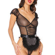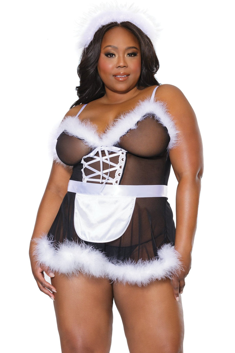 This intoxicating 3 Pc French Maid Babydoll Set just takes your breath away with its bold blend of satin, marabou and mesh. The teddy features crisscrossing lace detailing in front, and comes with removable satin & marabou apron and marabou headband.