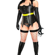 - Costume includes corset, satin ruffle skirt, bolero jacket with cape and red hair bow