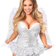 - Costume includes sequin corset, Sequin Skirt, Feather Wings, Halo