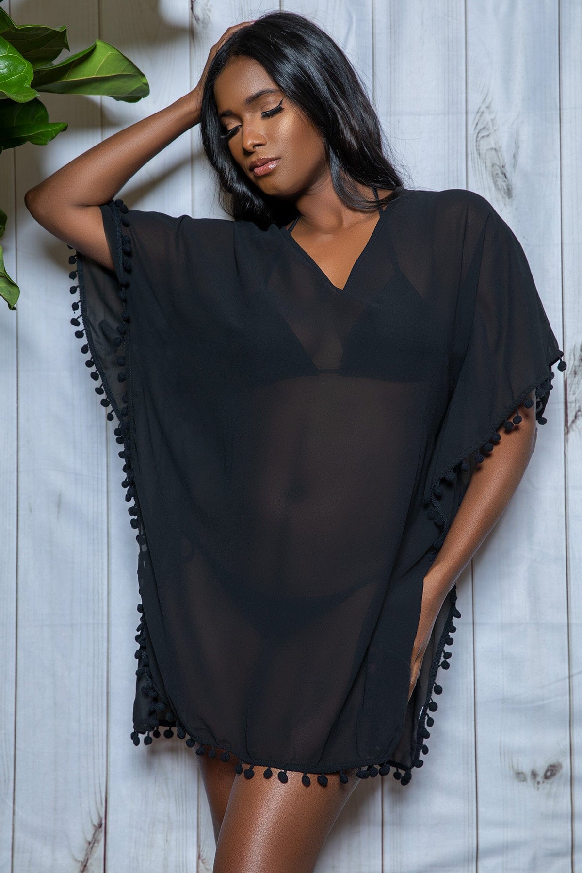 Sheer Poncho Cover-Up - V neckline - Short sleeves - Side slits - Pom pom trim Machine wash cold delicate cycle. Do not bleach. Do not tumble dry. Line dry in the shade. Cool iron if needed. Do not dry clean.