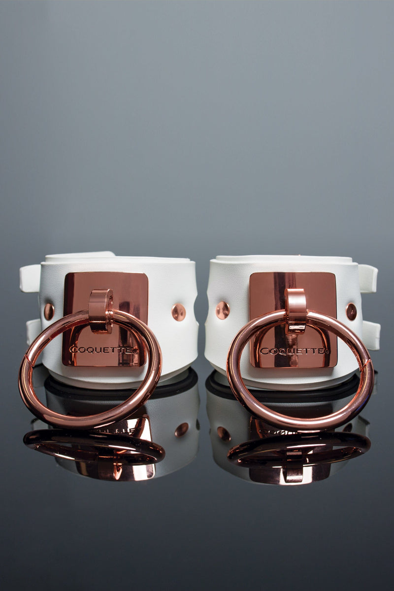 This metal-ring cuff features a large opening with adjustable buckle clasps to fit wrists between 5.9 - 8.25 inches (15 - 21 cm). Compatible with bondage lingerie and other accessories, this white and rose gold cuff is crafted from vegan leather and metal.