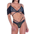 If you thought combining sequins and fishnet was crazy, check out this Sequin Fishnet Top with Fringe and sequin details! Thin straps with fringe circle the upper arms, and additional straps extend from the cups both over the shoulders and across the bust to secure the top in place. Shown with matching brief (sold separately).