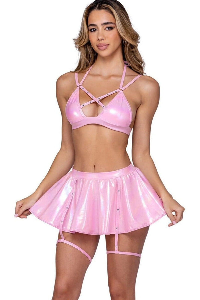 Prepare to steal the spotlight with our sizzling Strappy Bikini Top, featuring tantalizing metallic iridescent material and crisscross straps shimmering with rhinestone detail. This isn't your average swimwear—it's a glamorous showpiece that commands attention! Please note matching skirt sold separately.