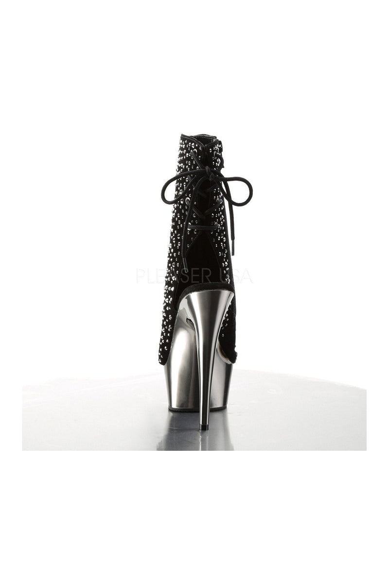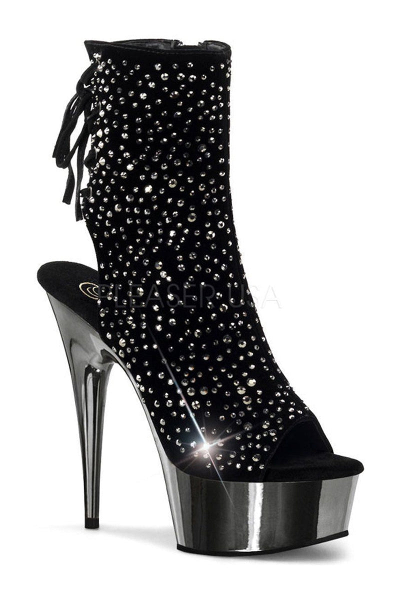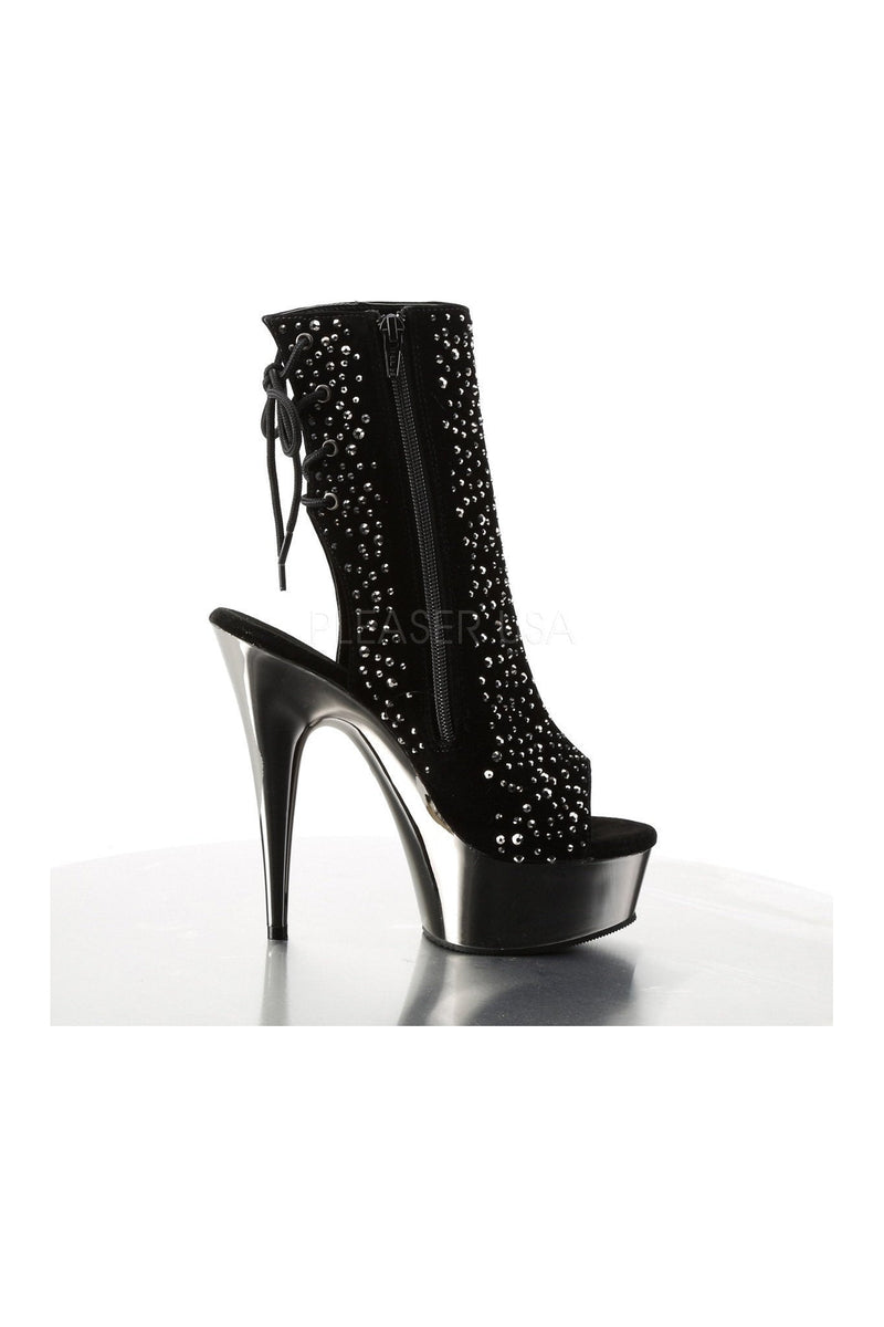 6" (15.2cm) Stiletto Heel 1 3/4" (4.5cm) Platform Open Toe/ Back Ankle Boot Featuring All Over Rhinestone Back Lacing & Full Inner Side Zipper