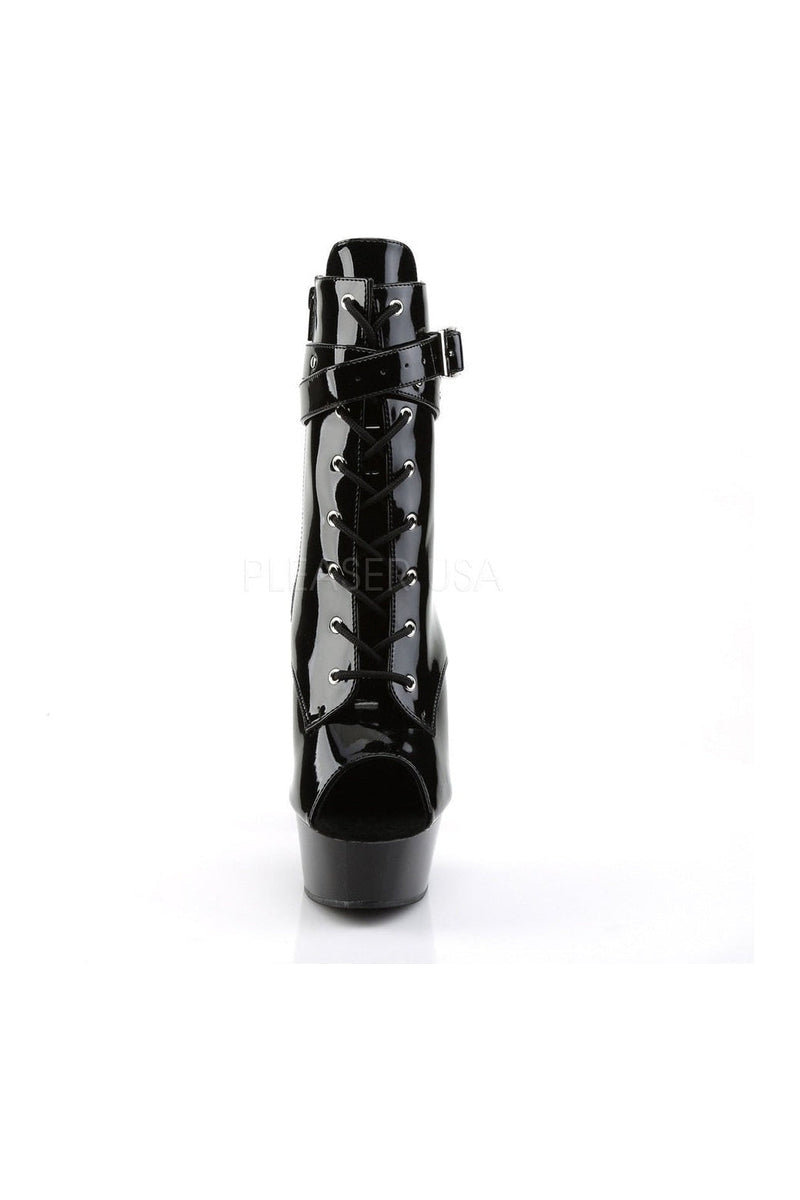 6" (15.2cm) Stiletto Heel 1 3/4" (4.5cm) Platform Peep Toe Front Lace-Up Ankle Boot with Wrap Around Buckled Strap Inside Zip Closure