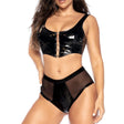 Two-piece set including bustier with sheer mesh and floral lace accents supportive underwire, built-in garter belts, shiny lace details and matching thong. Adjustable straps.