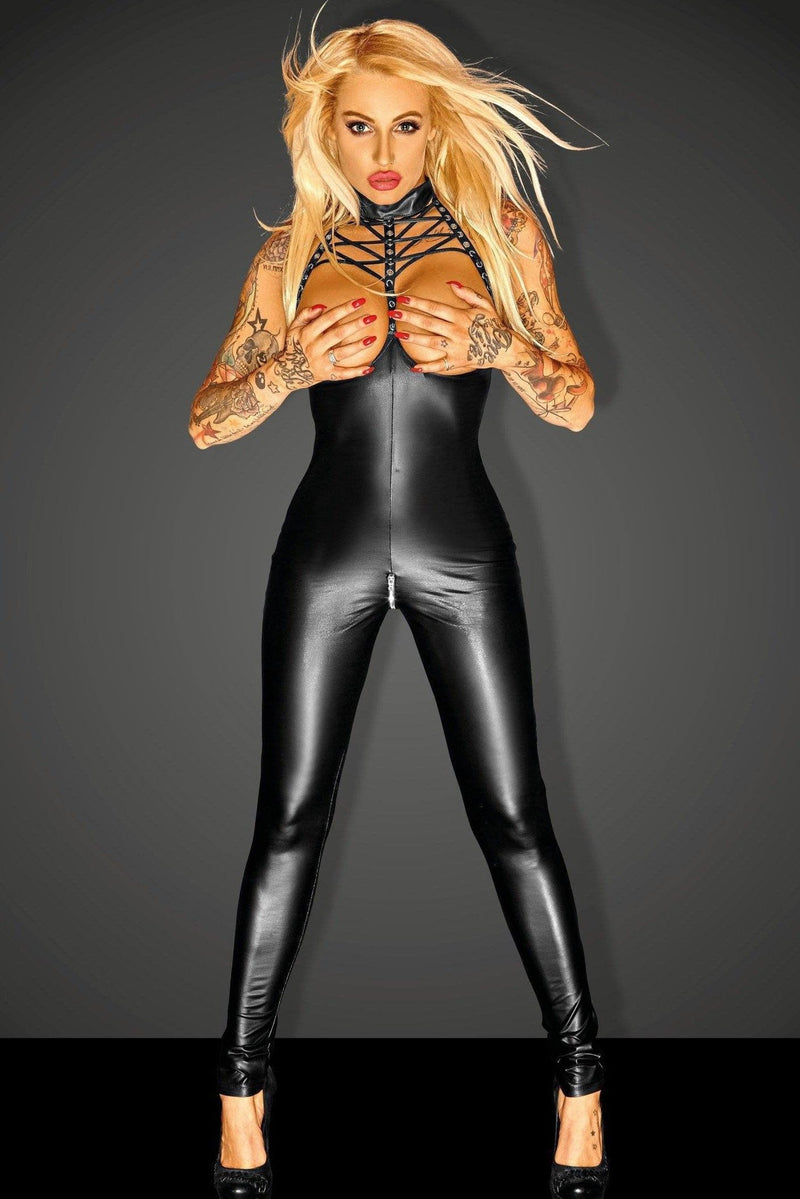 Ultra sexy overall. Breast - free top with seductive lacing. Eco leather tapes with silver eyelets. 2- way zipper in crotch for easy access.