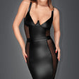 Powerwetlook minidress with long sleeve and corset across the waistline works to flatter the figure. Fine closing on hooks in front.