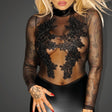 Glamorous sleeveless Powerwetlook mini dress with deep cleavage. Gorgeous embroidered lace will accentuate feminine curves.