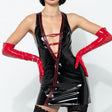 A daring, revealing look that will make you stand out from the crowd! Experience the thrill of taking fashion risks with the LIONNE Long Vinyl Dress. The plunging neckline adds an edgy touch, while the low cut back and side slit add a bold and adventurous element. Don't settle for ordinary, dare to be different with this head-turning dress! Gloves not included.