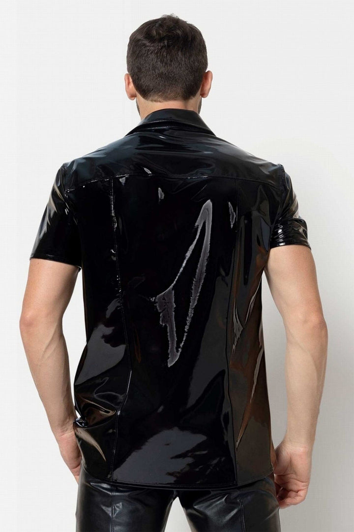 Choose a daring appearance with the Finn shirt in black vinyl, showcasing short sleeves and a timeless fit. Its bright luster and sleek material are sure to catch attention. Accentuate it with leather or vinyl pants for an adventurous, fashion-forward style, perfect for special events or evening adventures.