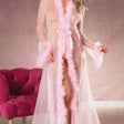 Beautiful Stretch Lace Long Sleeve Robe trimmed with mesh band and tie belt. Comes with Stretch Lace G-String. Colors: Black, Red, White. Sizes: S/m, L/xl. Also available In Plus Sizes.