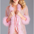 Sheer Nylon Long Robe lavishly trimmed with Marabou Feathers and ribbon tie front. Colors: Black, Pink, Red, White. Sizes: One Size. G-String for photography only.