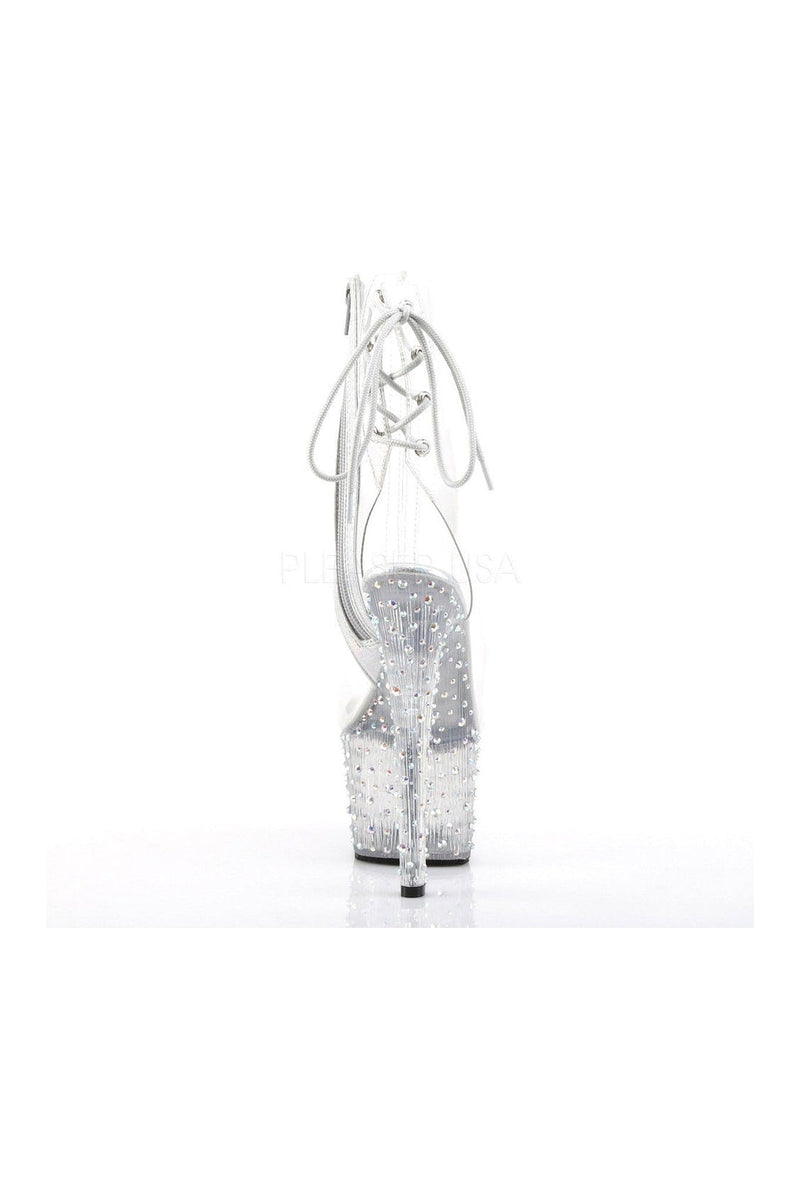 7" (17.8cm) Heel 2 3/4" (7cm) Platform Open Toe/Heel Lace-Up Back Ankle Boot Featuring Multi-size Rhinestone Encrusted on the Bottom Inside Zip Closure