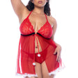 You will be the perfect Christmas gift in this lace and mesh babydoll with feather trims and front tie with pompom details. Includes matching thong.