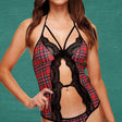 Plaid, lace, and sheer all around! This sultry chemise is carefully designed to make all your assets POP! Sheer, lace cups keep it feeling romantic, while a sheer black body, designed with accents of flirty plaid, amp up the schoolgirl sex appeal! Strappy ties at the back can adjust to make it fit just right!