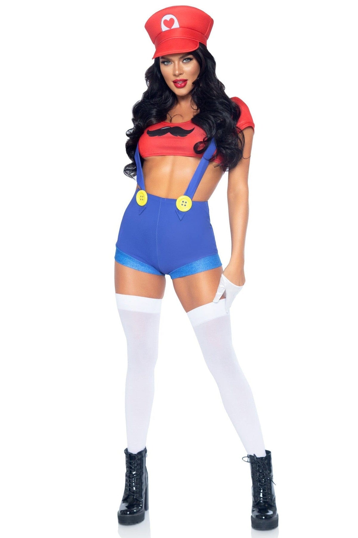 3 Piece Gamer Babe, includes character crop top, suspender shorts with icon accents, and hat.