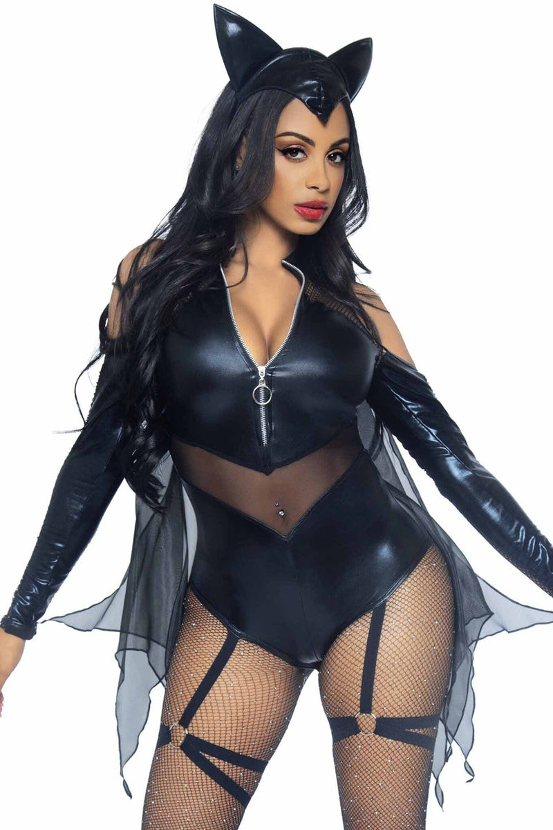 2 Piece Midnight Bat, includes zip up garter bodysuit with snap crotch, attached sheer scalloped wings, and ear headband.