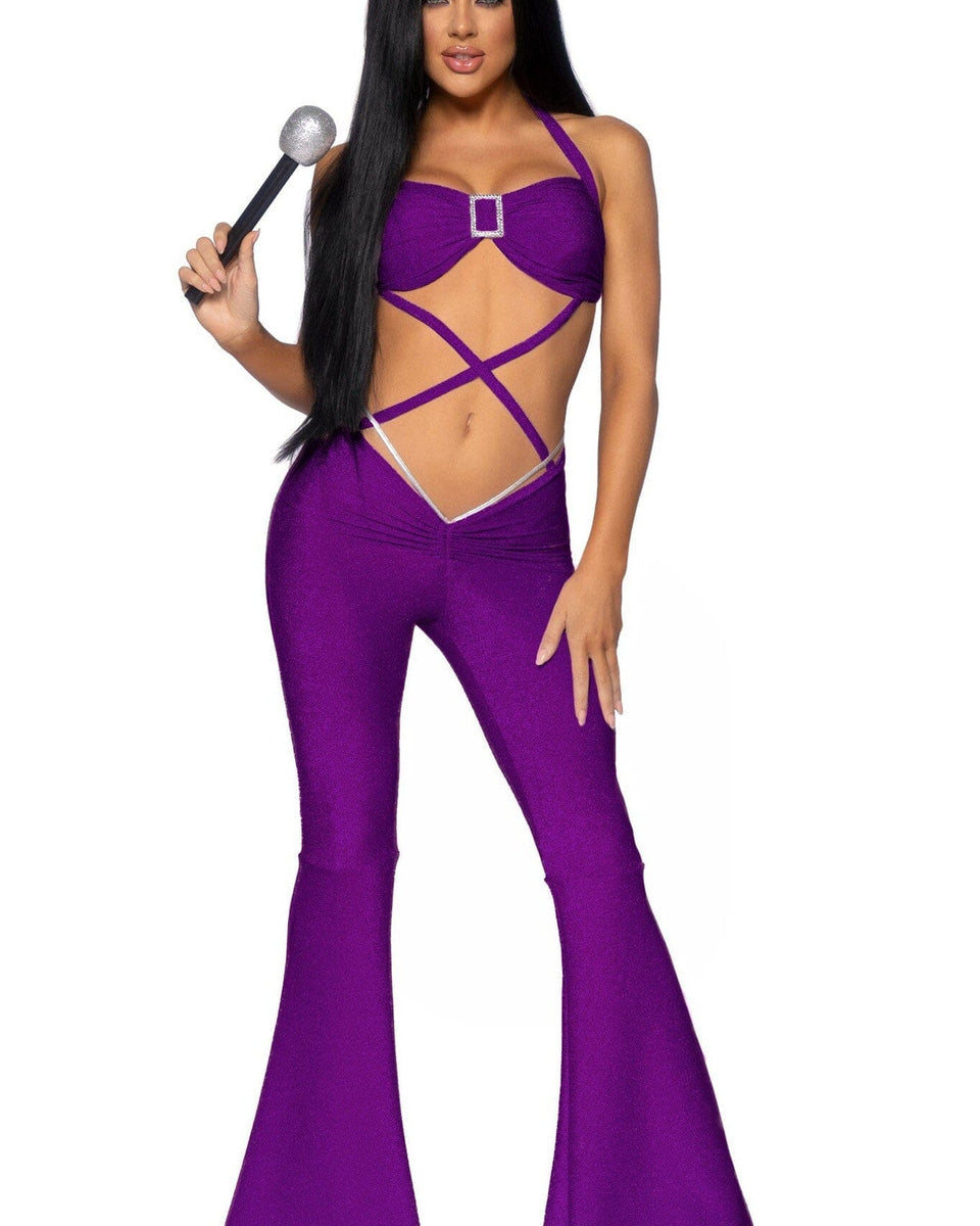 Pop Star, features shimmer jumpsuit with strappy midriff and ruched low-cut waist, faux rhinestone buckle accent, and flared legs.