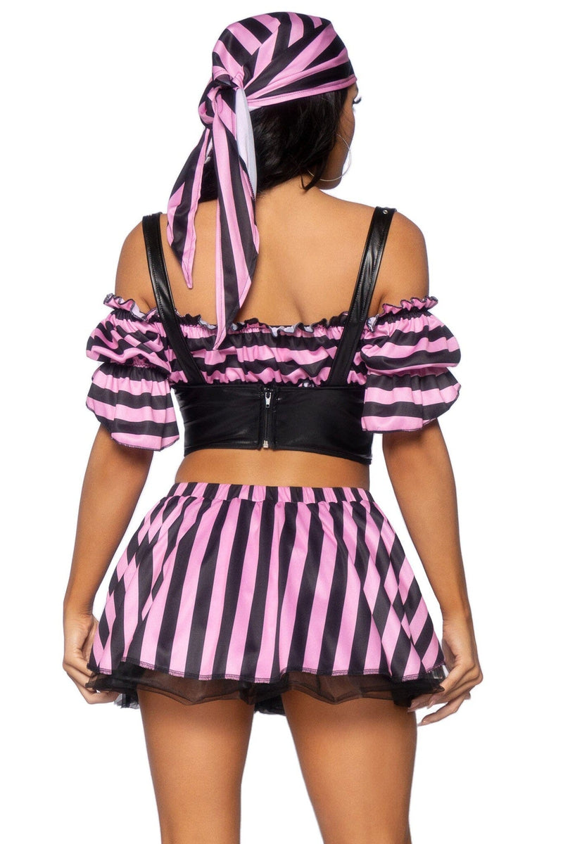 5 Piece Treasure Hunt Pirate, includes bandeau top with puff sleeves, under bust corset with buckled straps, skirt with ribbon pick-ups, eye patch, and matching head scarf.
