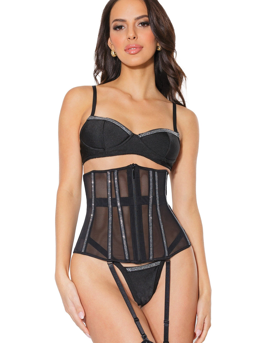 Add an extra layer of seduction with this sheer Waist Cincher featuring rhinestone trim detailing on the front, adjustable and removable garter straps, plus the classic corset lace-up look in the back finished with a satin bow. Waist Cincher zips in the front and is pictured with matching 2 Pc Bra and G-String Set (sold separately).