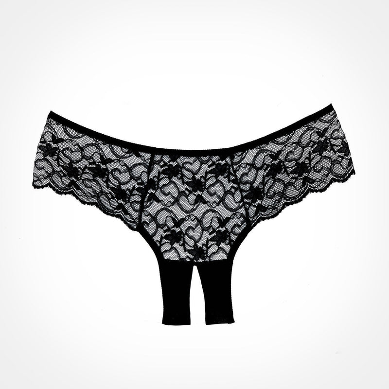 A whirlwind of scalloped lace covers your hips and derriere in this sumptuous open gusset boy cut panty.